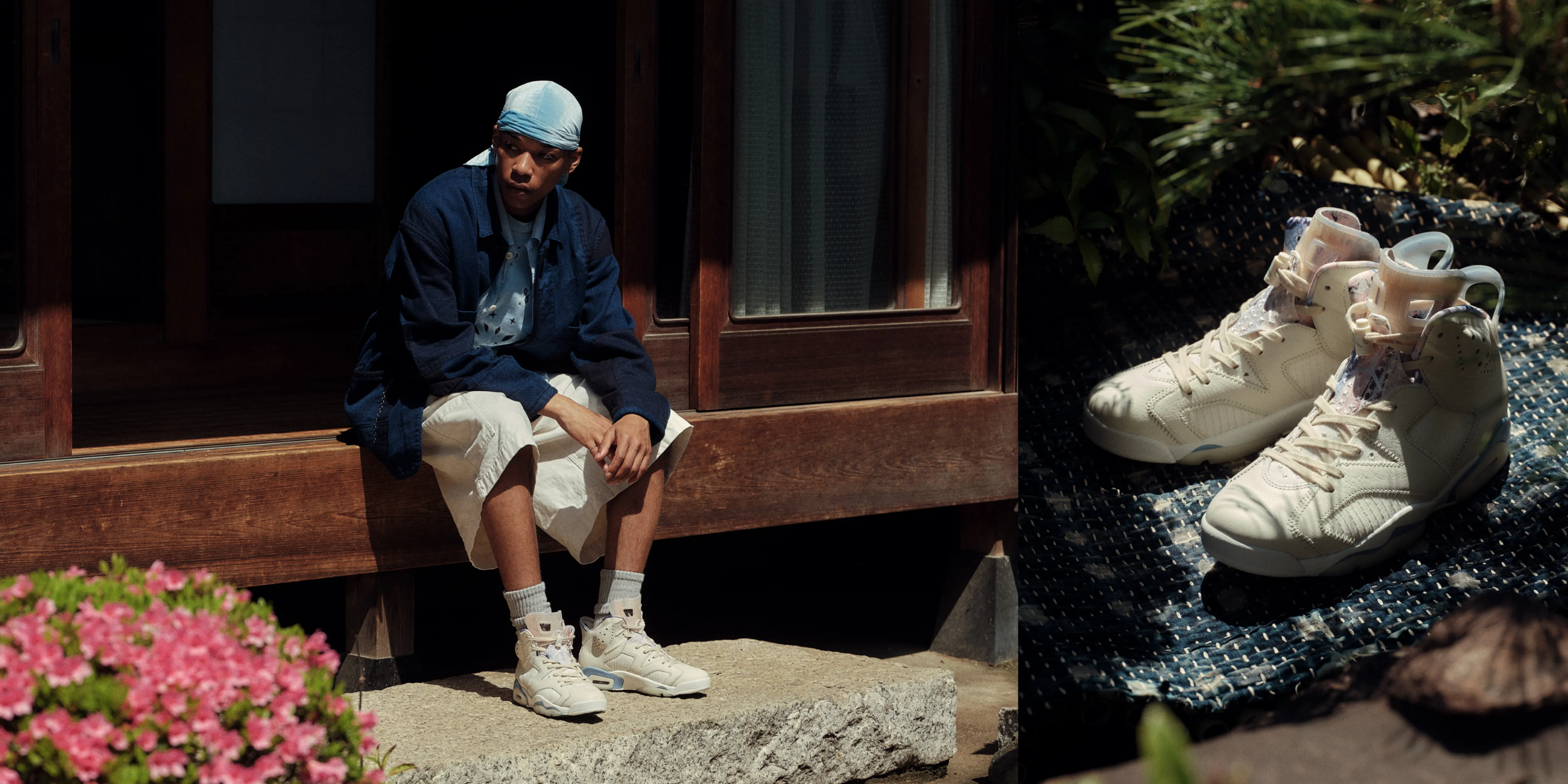 アッパーには異素材とペールアイボリーやライトボーンのような柔らかなカラーリングを重ねることで、AIR JORDAN 6のシルエットに日本的な美意識を落とし込んでいる。