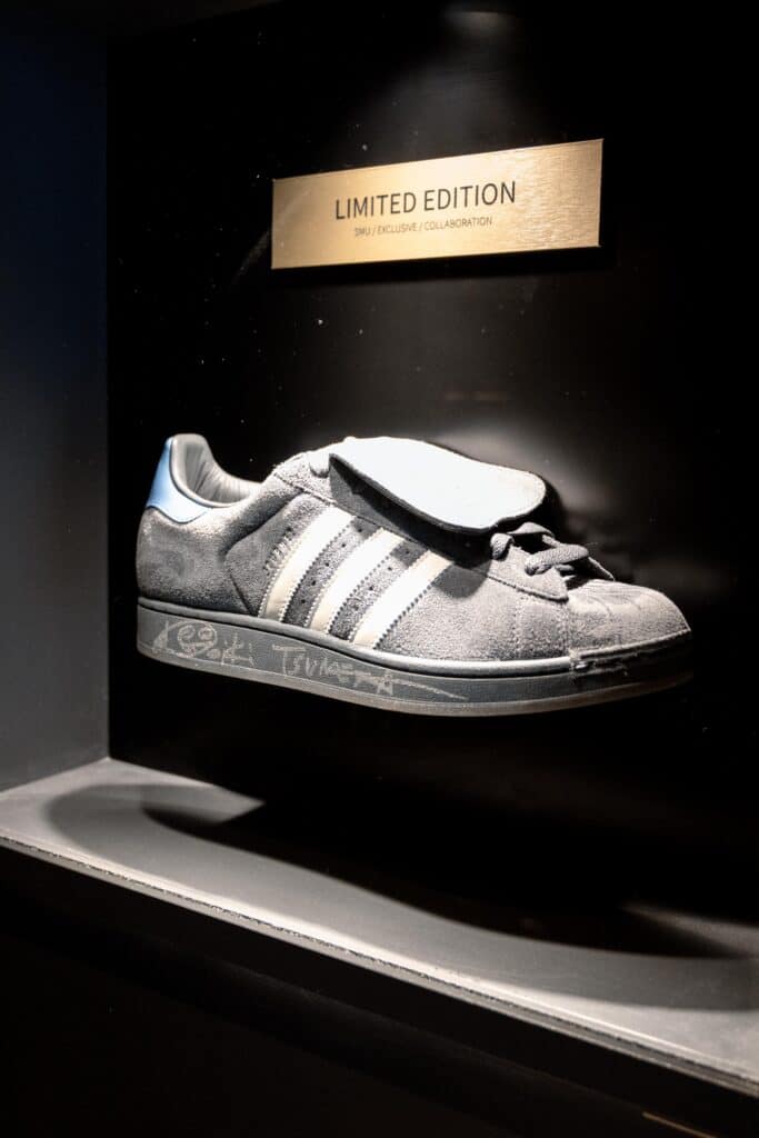 外看板には本人のサイン、2Fにはサイン入りの2足を展示。
